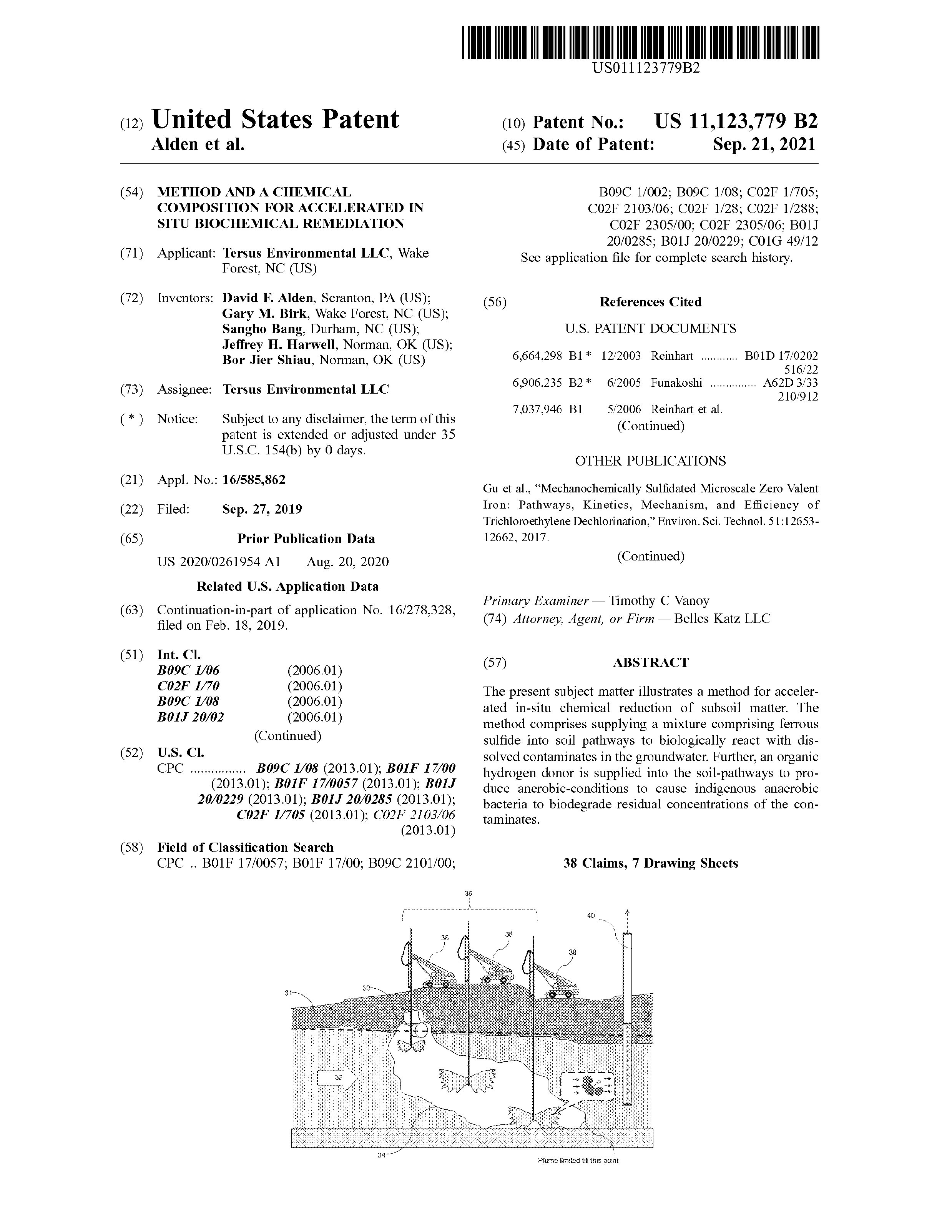 Officially granted on September 21, 2021, the ‘779 patent is titled, “Method and a Chemical Composition for Accelerated In Situ Biochemical Remediation.” The claims are generally directed towards a method for supplying a mixture comprising ferrous sulfide and zero-valent metal particle reactants into soil pathways to biologically react with dissolved contaminants in groundwater. Further, an organic hydrogen donor is supplied into the soil-pathways to produce anaerobic-conditions to cause indigenous anaerobic bacteria to biodegrade residual concentrations of the contaminants. The claims are also generally directed towards a chemical composition comprising vegetable oil, an oil thickening agent, and a surfactant forming suspension networks for ferrous sulfide and zero-valent metal particle reactants, wherein said suspension network comprises ferrous sulfide and zero-valent metal particles encapsulated within a liquid membrane formed of the vegetable oil.